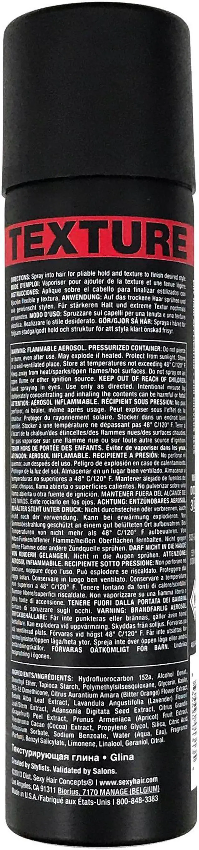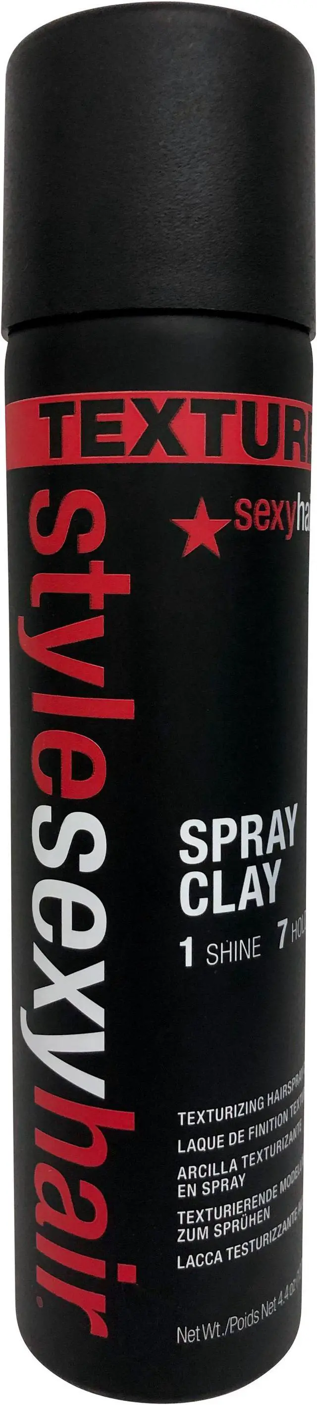 Sexy Hair STYLE Sexy Hair SPRAY CLAY Texturizing Spray Clay 4.4 ozStyle Sexy Hair Spray Clay Texturizing is a "next generation" of styling that gives you the effect of clay in an easy to use spray form. Spray Clay Texturizing allows for a fine and even application to achieve an allover texturized look that is great for all hair types needing added texture and movement with a dry, non-waxy hold.