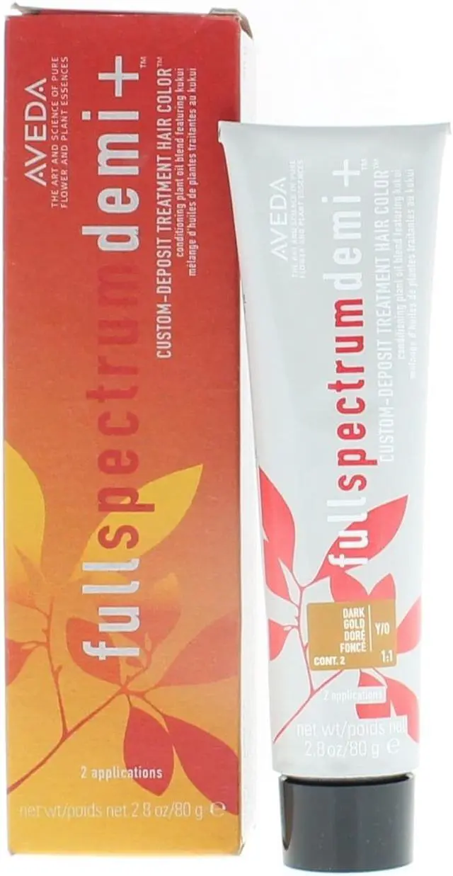 Aveda Full Spectrum Demi+ Dark Gold-Y/O Deposit Treatment Hair Color 2.8 Ounce 80 Milliliters Aveda’s Full Spectrum Demi+ Custom-Deposit Treatment Hair Color is available in ten naturals shades and ten tones. The shine is vastly improved with certified organic kukui essential oil in combination with certified organic castor and jojoba oils. A customizable processing time is another improvement. Depending on the end result desired, colorists can choose to process five minutes with a five-volume developer (full processing time for a sheer tonal result) or up to 20 minutes with a 10-volume developer for more opaque gray blending. All this is possible with a new gel formula that drives into hair and penetrates without the use of ammonia. The formula itself, true to Aveda, is filled with plant-derived oils including L-arginine, which works as a power booster to increase pH for maximum color deposit into every strand, which provides lasting results that fade on tone.