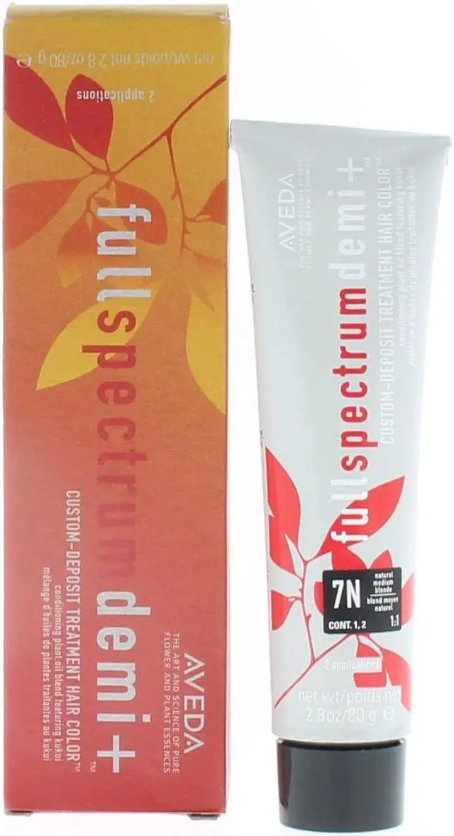 Aveda Full Spectrum Demi+ 7N-Natural Medium Blonde Deposit Treatment Hair Color 2.8 Ounce 80 Milliliters Aveda’s Full Spectrum Demi+ Custom-Deposit Treatment Hair Color is available in ten naturals shades and ten tones. The shine is vastly improved with certified organic kukui essential oil in combination with certified organic castor and jojoba oils. A customizable processing time is another improvement. Depending on the end result desired, colorists can choose to process five minutes with a five-volume developer (full processing time for a sheer tonal result) or up to 20 minutes with a 10-volume developer for more opaque gray blending. All this is possible with a new gel formula that drives into hair and penetrates without the use of ammonia.
