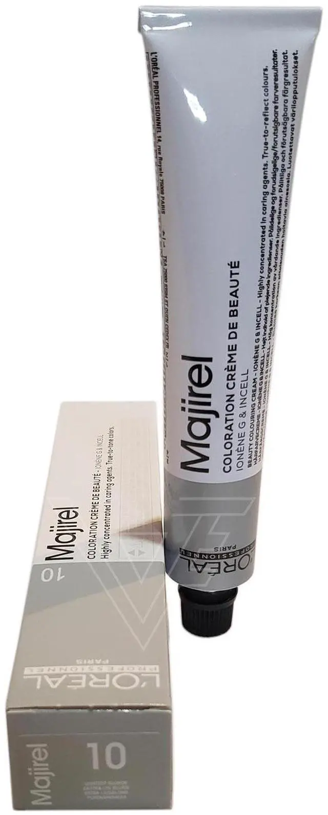 Loreal Majirel Hair Color Ionene G Incell (10) -Also Known As 10/10N This is a permanent color with Ionene technology for uncompromised comfort. Lightens up to 4 levels in 35 minutes. Covers up to 100% of white hair. Easy to mix and apply. Leaves hair with sublime shine feeling intensely nourished and hydrated until next color treatment. Loreal Majirel makes hair softer than before coloring process. Mix 1 to 1 ratio. These color tubes are imported from Europe and display shade number slightly different, but contain the same color as US counterpart.