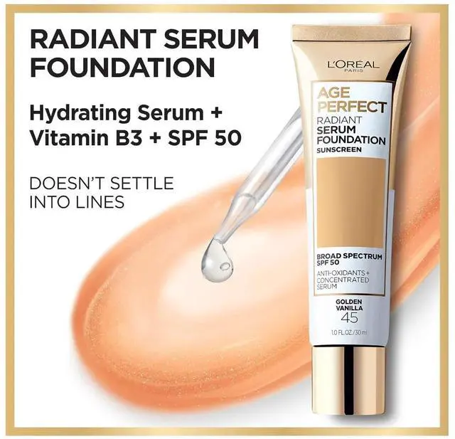 The L'Oréal Age Perfect Radiant Serum Foundation with Sunscreen in Amber Beige #95 is a premium liquid foundation specifically formulated for mature and sensitive skin. This lightweight product provides natural, buildable coverage with a luminous finish that enhances your complexion without settling into fine lines or wrinkles.