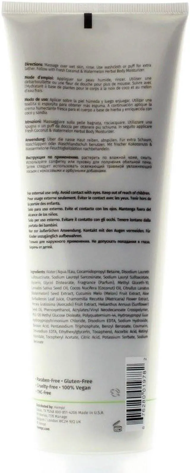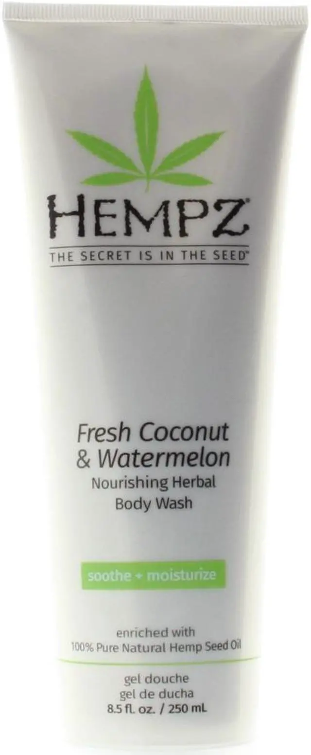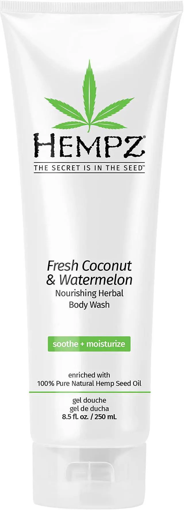 Hempz Fresh Coconut & Watermelon Nourishing Herbal Body Wash is enriched with 100% Pure Natural Hemp Seed Oil and infused with our signature blend of soothing Chamomile and Avocado Extracts, Omega rich Vitamin E, and hydrating Coconut Oil and Watermelon Extract to help cleanse, nourish and moisturize skin.