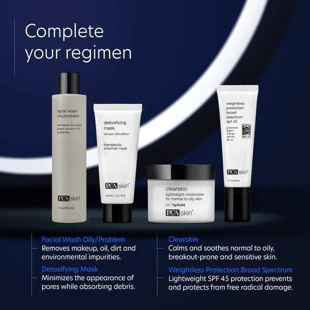 PCA SKIN Facial Wash Oily/Problem is formulated with a higher level of alpha hydroxy acids for cleansing breakout-prone skin. This gentle cleanser controls oil production and banishes acne without irritation. Soothing aloe vera extract calms redness and inflammation to leave the complexion looking clear, calm and clean. Gentle exfoliation Contains a unique blend of ingredients that soothe and protect the skin Cleansing blend that purifies the skin and minimizes breakouts Active Ingredients: Lactic acid found in milk and sugars, this ingredient moisturizes the skin. Aloe vera leaf juice a purifying ingredient that softens and soothes the skin. Gluconolactone a gentle antioxidant that is calming, provides moisture and promotes a clear complexion. Directions:Apply a dime-sized amount to damp skin and massage into a light foaming lather. Rinse with warm water and pat dry. Follow with the appropriate PCA SKIN toner, treatment serums and broad spectrum SPF product in the daytime, and moisturizer in the evening.Formulated with Beautiful Skin in MindOur products are scientifically developed and carefully formulated to improve the health and appearance of your unique skin. We understand the importance of formulating with the best combinations of innovative ingredients to provide you with safe, highly effective products that deliver on their promises. All of our products are free of potential irritants like synthetic dyes and fragrances. PCA SKIN does not perform or condone animal testing.