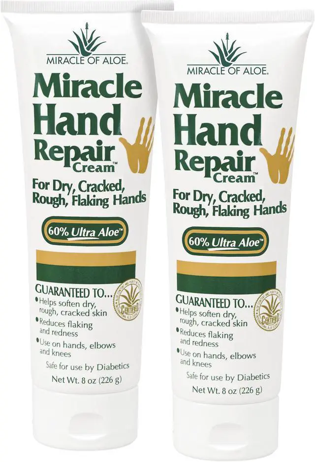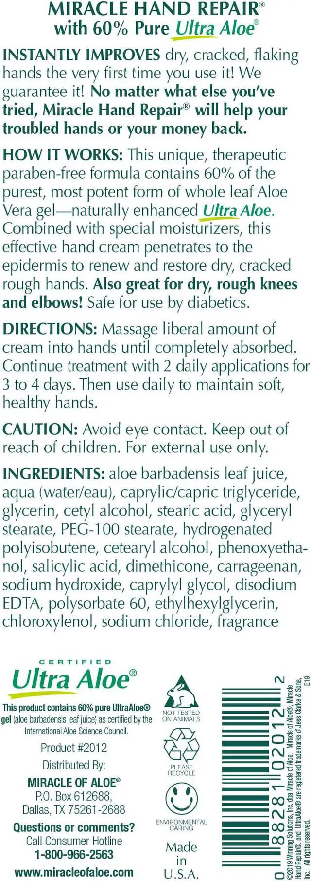 END DRY, CRACKED, RED, ROUGH HANDS FOREVER! Miracle of Aloes unique Miracle Hand Repair Cream is specially formulated with naturally enhanced 60% pure UltraAloe aloe vera gel to provide maximum moisturization and rejuvenating power to soften and restore hands. Combined with special moisturizers to effectively penetrate through layers of dry, hardened skin, this highly effective hand cream helps speed up cell renewal and repairs dry, cracked and flaking hands. Just a small amount of this rich long-lasting rejuvenating cream goes to work immediately to soften, moisturize, and restore damaged skin.