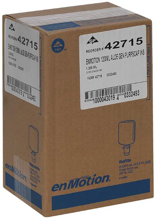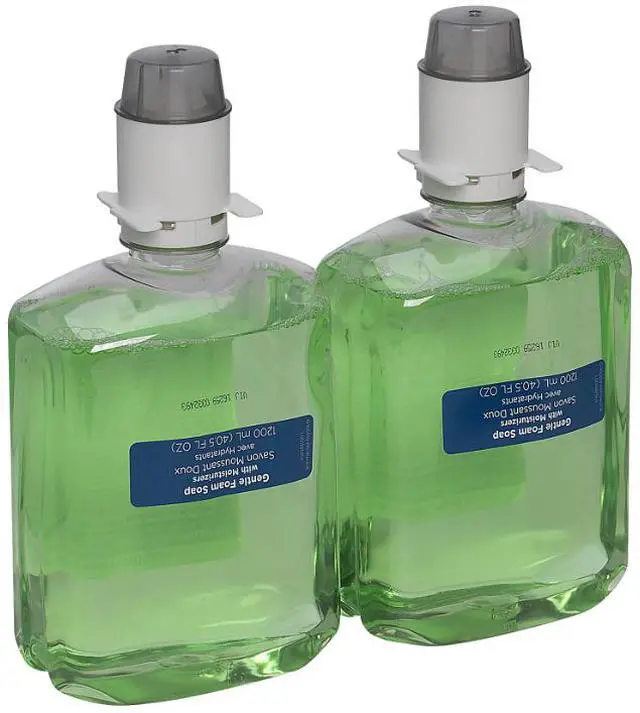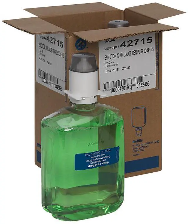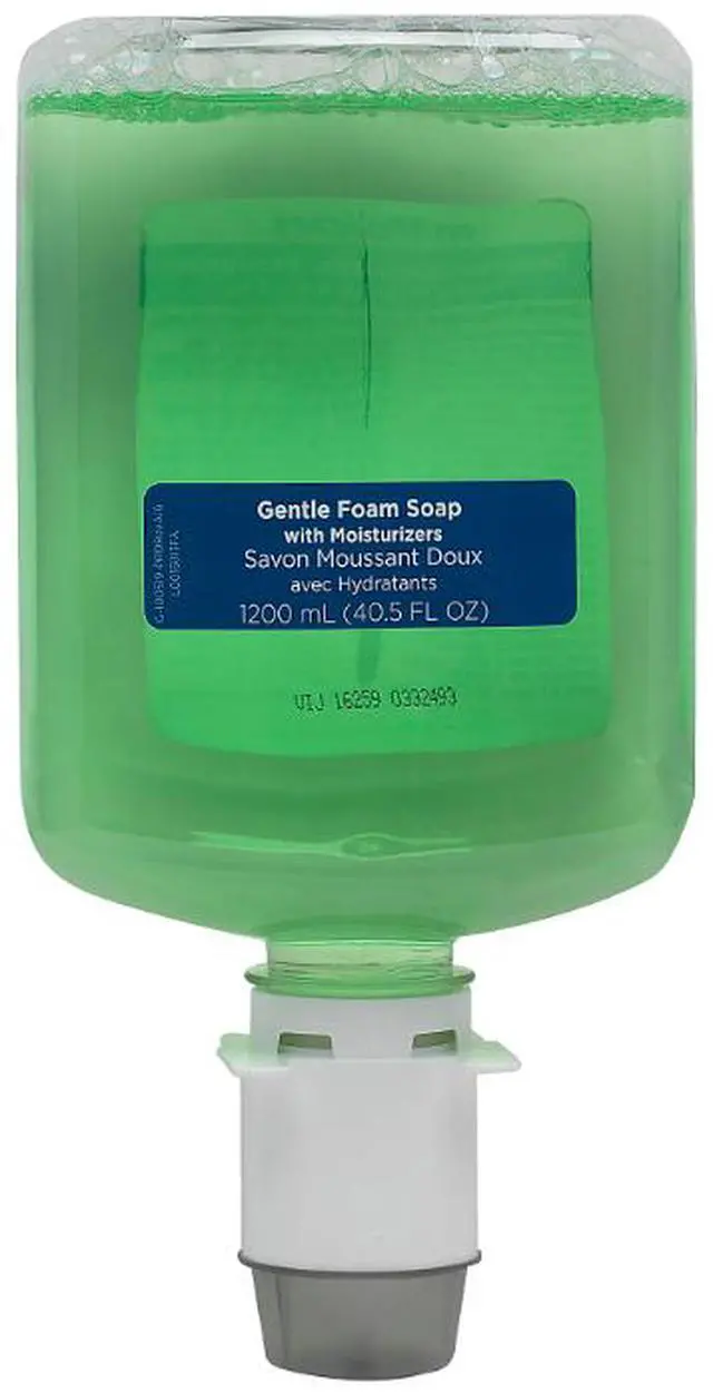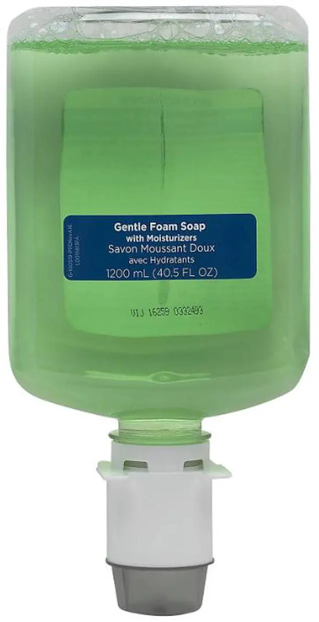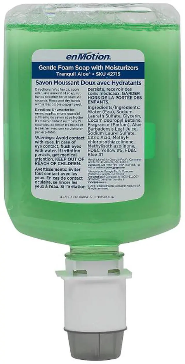 enMotion Tranquil Aloe Gentle Foam Soap With Moisturizers features a rich foaming lather and hypoallergenic formula. It leaves skin feeling fresh, and is gentle enough for daily use. This rich foaming aloe formula gently cleans and moisturizes skin. Closed hygienic refill bottles. Dispenses at least 99% of foam product before replacement is needed. Designed for use with enMotion Automated Touchless Soap Dispensers. (sold separately. ) RICH FOAMING formula moisturizes as it cleans HYGENIC refills are sealed to help reduce risk of cross contamination EASY TO MAINTAIN with high-capacity refills that reduce runout and are designed for easy one-hand loading 100% RECYCLABLE BOTTLES, contain 25% post-consumer content THIS PRODUCT MEETS Green Seal Standard GS-41A based on effective performance and protective limits on VOCs and human & environmental toxicity.