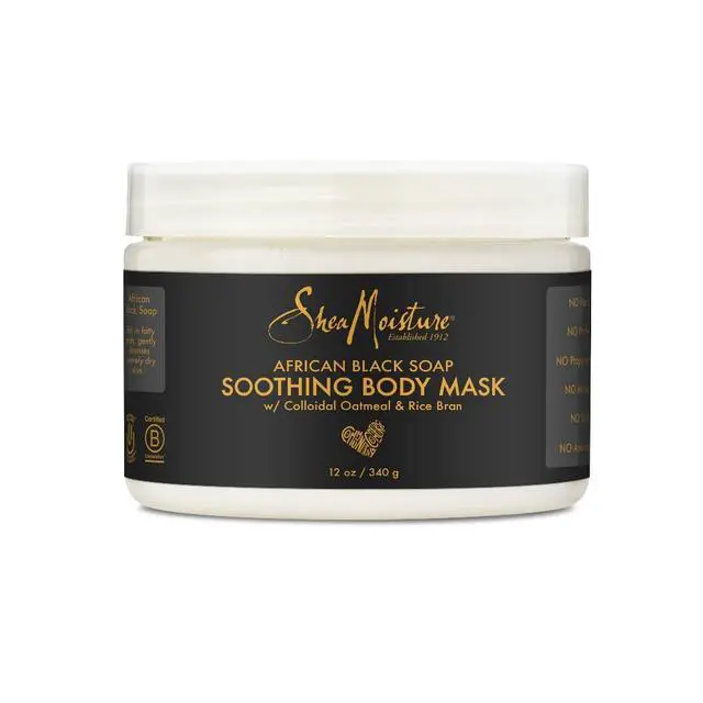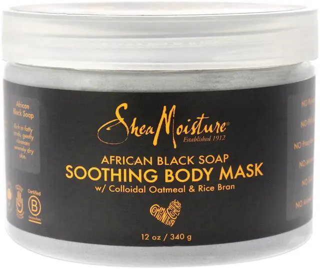 This body mask treatment will leave skin comforted, balanced, and smooth. It relieves dry, itchy skin with a soothing blend of pure African black soap, rice bran, and colloidal oats.