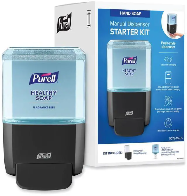• Package Includes: (1) Manual Push-Style PURELL ES4 Soap Dispenser; (1) PURELL Healthy Soap Gentle and Free Foam Refill; Adhesive Mounting Tape