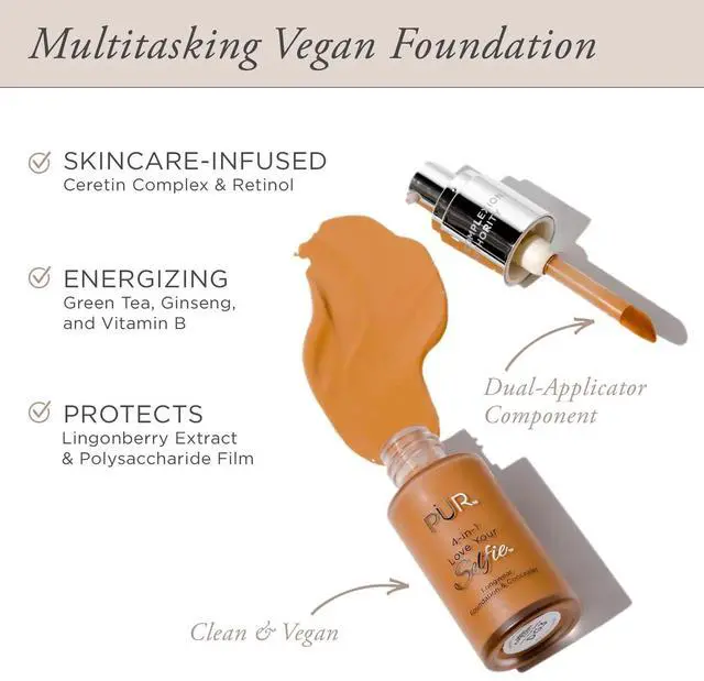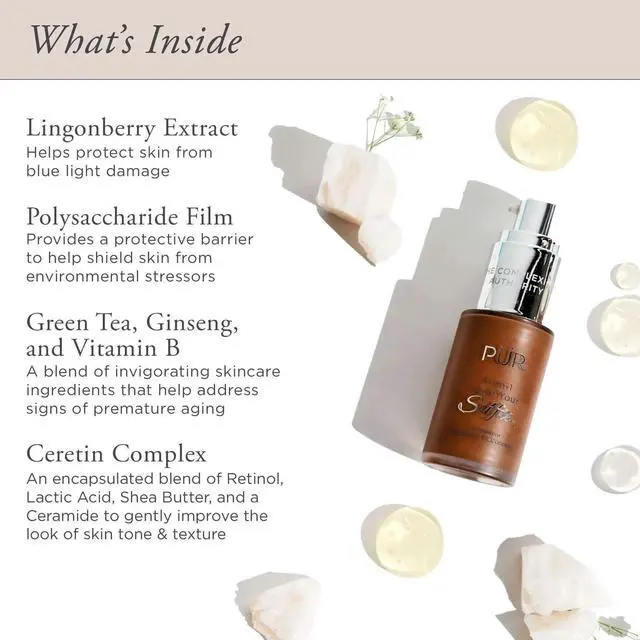 • Skin-Loving Ingredients: Infused with PÜR's proprietary Ceretin Complex, plus ginseng, green tea, and vitamin B. These ingredients work together to nourish, brighten, and renew the skins appearance with every wear.