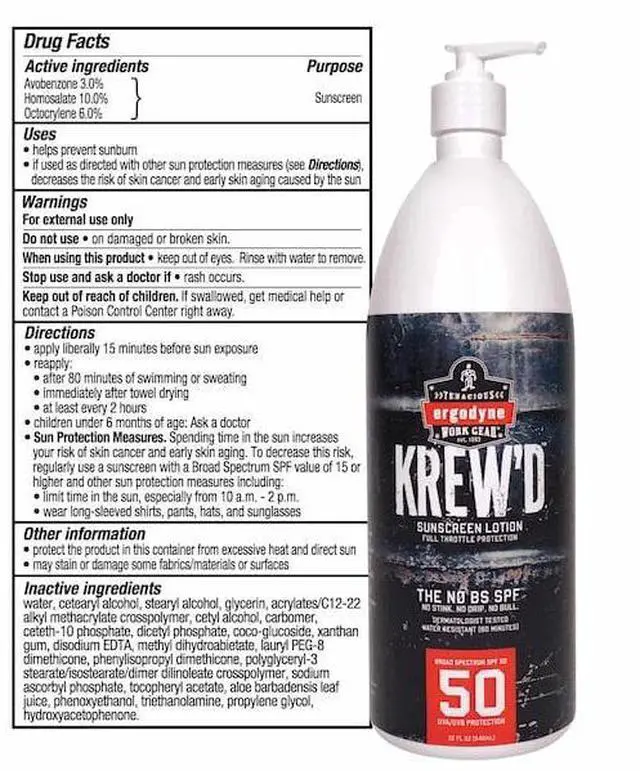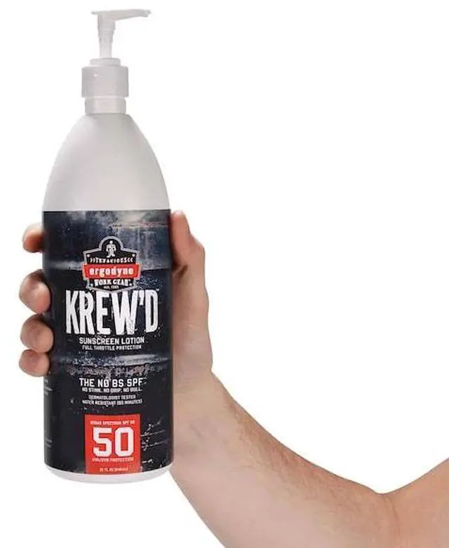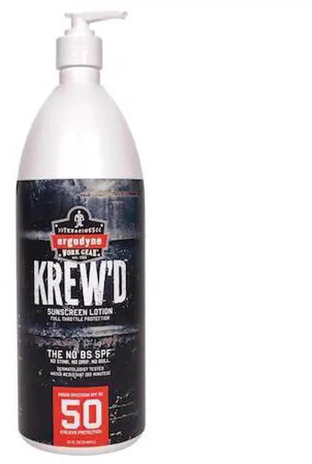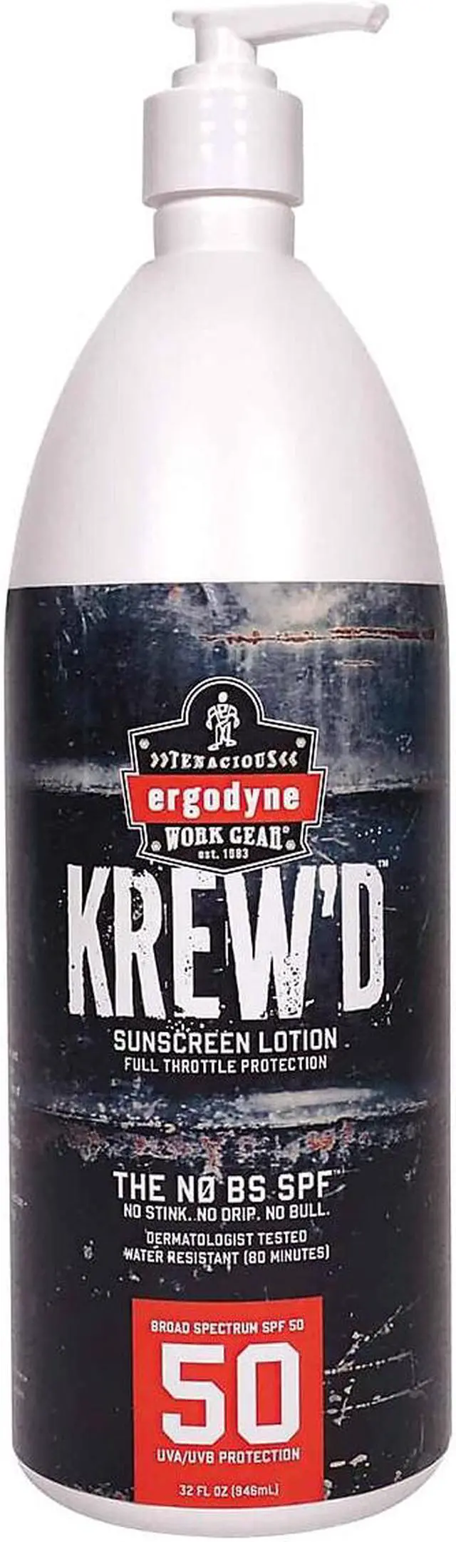 The Ergodyne KREW'D SPF 50 sunscreen lotion ensures safe and effective broad-spectrum UVA/UVB protection against sunburns. The lotion provides a water-resistant and sweat-resistant sunscreen for 80 minutes. This FDA-approved sunscreen comes in a 32 oz. pump container for fast and easy application of SPF 50 protection against both UVA and UVB rays that can cause skin cancer. The 32 oz. crew-sized KREW'D is an economical option for people using more sunscreen.