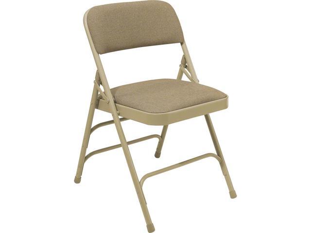 - The National Public Seating 2300 Series steel frame upholstered premium fabric seat and back folding chair has a beige 18 gauge, 7/8" tubular steel "Y-frame" structure, cafe beige upholstered fabric seat and backrest, three double-riveted leg cross braces, double hinges on each side, and it folds for efficient storage when not in use. This chair meets the American National Standards Institute/Business & Institutional Furniture Manufacturers Association (ANSI/BIFMA) standard for drop weight support of 300 lb., and it supports 480 lb. of static weight. It has three double-riveted leg cross braces (two on the back legs, one on the front), and double hinges on each side for stability. The seat and backrest are upholstered for comfort, with 1-1/4" thick, 0.9 lb. density foam in the seat and 1.2 lb. density foam in the backrest, and covered with fabric abrasion tested to withstand 30,000 double rubs for durability under heavy use (abrasion testing uses an oscillatory cylinder tester to rub a