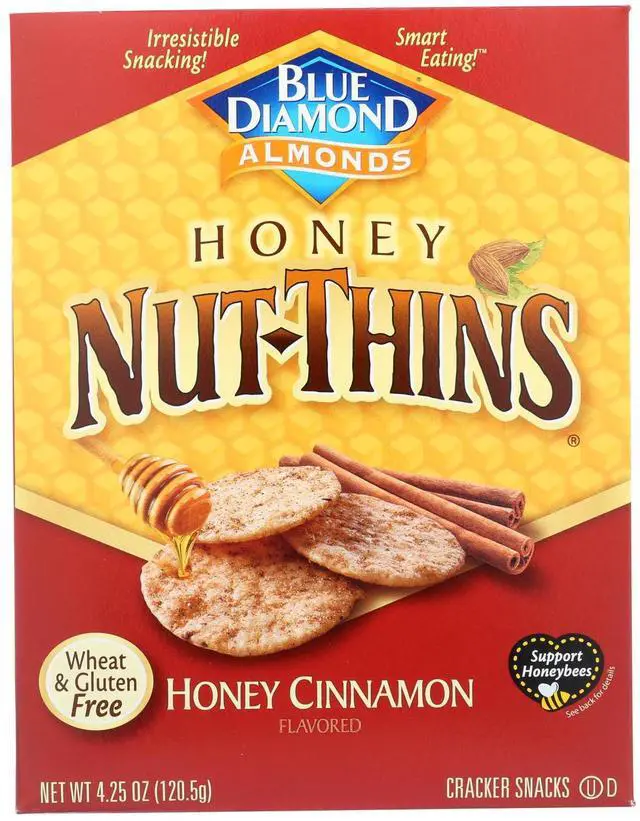 Blue diamond nut-Thins, honey cinnamon are a delicious snack, either on their own or with other treats. Made with natural ingredients, blue diamond nut-Thins are free of unnatural and unnecessary additives, leaving you with pure, natural and simple taste. This product is gluten-Free and kosher. Each box of blue diamond nut-Thins, honey cinnamon weighs 4.25 oz. With four servings per box and 130 calories per serving. See nutrition facts panel for allergens.