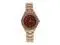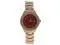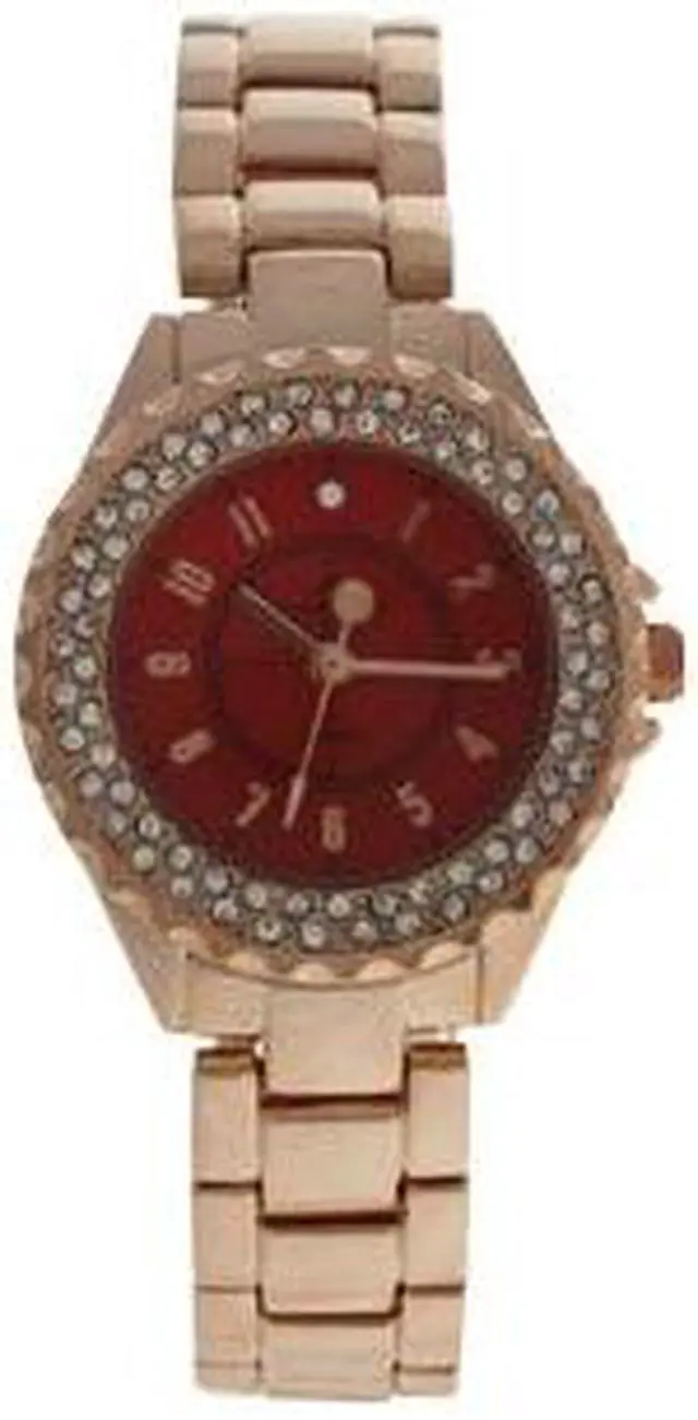 Stainless steel case with a stainless steel bracelet. Swarovski stones for the bezel. Gold steel strap. Mineral glass red dial with goldtone hands. Diamond accents are featured on the bezel. Dial Type Analog. Quartz movement.