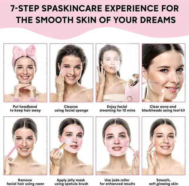 * **7-Piece Professional Tool Kit: ** Comes with a headband, handband, blackhead extraction kit, facial razor, silicone brush, jade roller, and sponge puff for a complete cleansing, exfoliation, and massage routine.