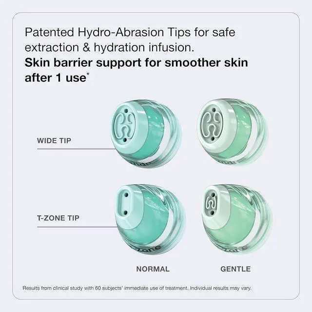 Skin Barrier Support: Gently exfoliates with patented hydro-abrasion tips designed to support skin barrier repair for smoother skin after 1 use*. *Results from clinical study with 60 subjects' immediate use of treatment. Individual results may vary.