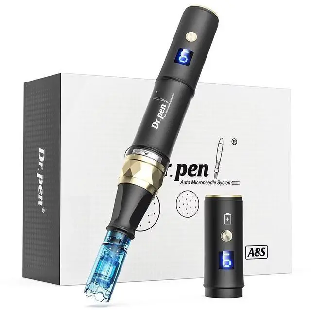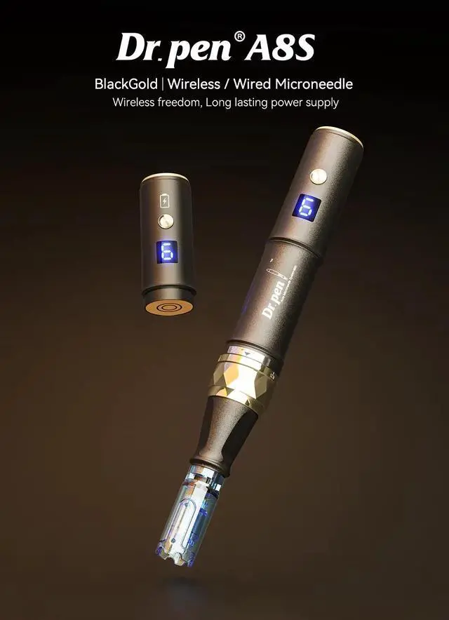 Introducing the A8s an advanced skincare microneedling system. The A8s comes with 1 battery one for wireless mode and one module for wired use. Its beautiful on matte design make it the perfect choice for busy professionals. Plus, with 6 powerful speed settings and an LED screen, you'll be able to customize your treatments dependant on your needs.