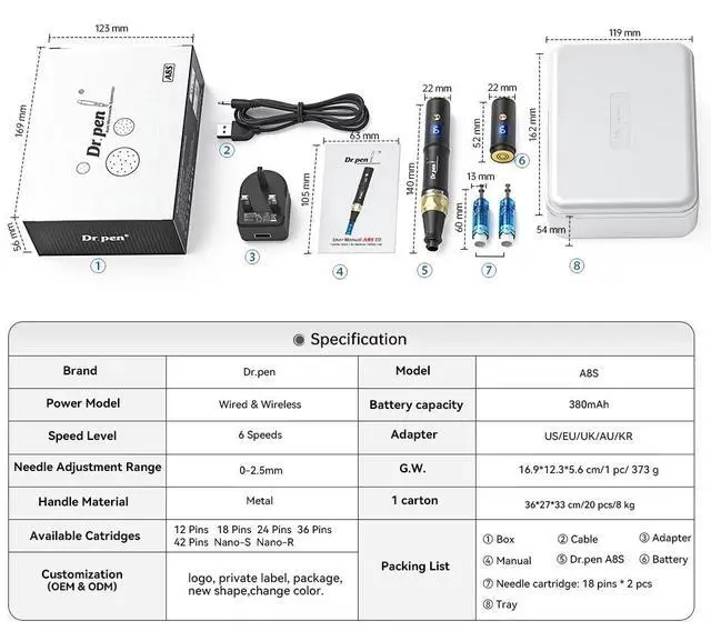 The A8S is one of the most powerful microneedling systems available, its high-performance motor operates at a remarkable speed of up to 18,000 RPM with 6 speed settings operated by the easy 1 touch button You are in total control ensuring faster and more effective treatments, delivering optimal results for skincare enthusiasts and professionals alike.