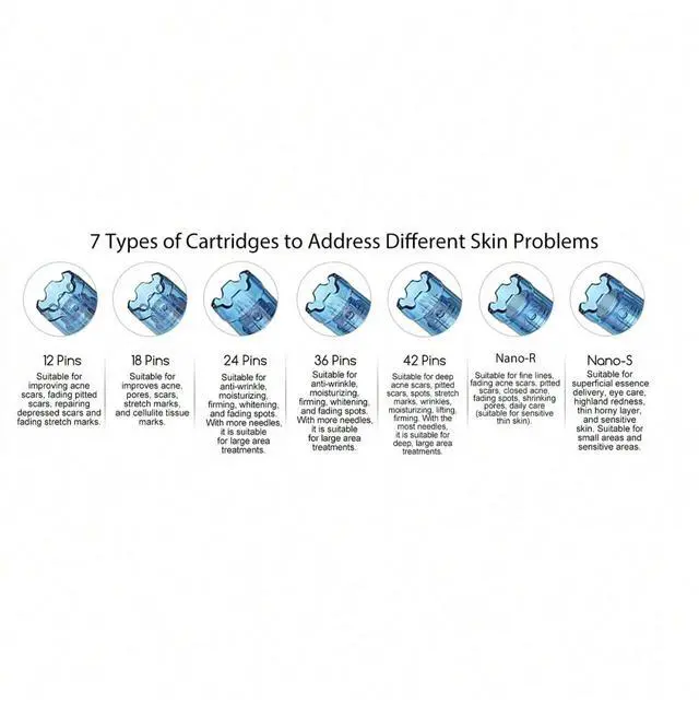 18 Pins: Needles made of 304 stainless steel, suitable for improves acne, pores, scars, stretch marks, and cellulite tissue marks.