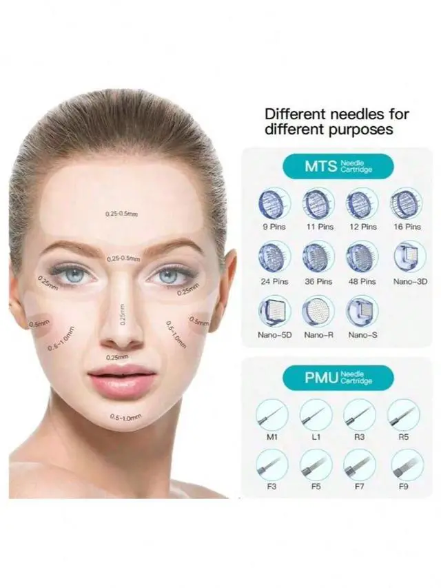42 Pins: Needles made of 304 stainless steel, suitable for deep acne scars, pitted scars, spots, stretch marks, wrinkles, moisturizing, lifting, firming. With the most needles, it is suitable for deep, large area treatments.