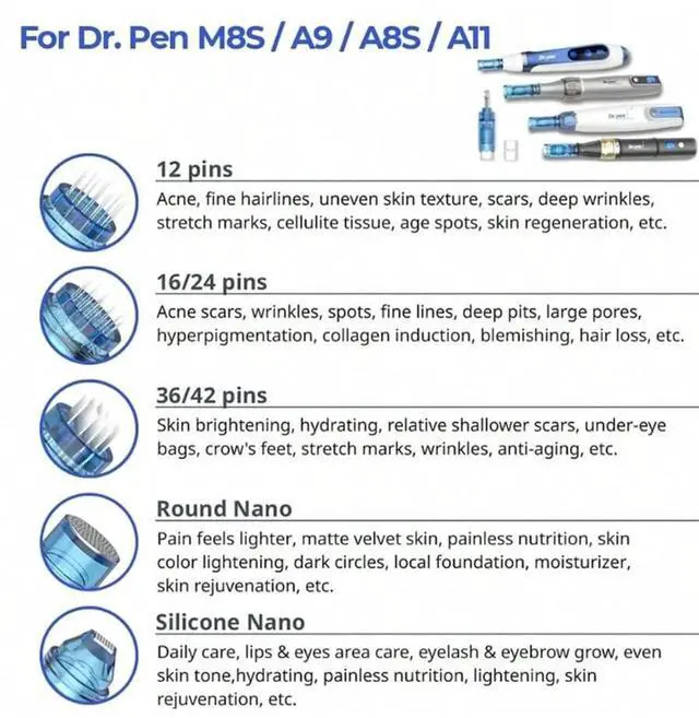 The main difference between Dr.pen M8S/Dr.pen A8S/Dr.pen A9/Dr.pen A11 cartridge models is the number and shape of the needles. Different needle types are suitable for different skin issues and treatment areas.