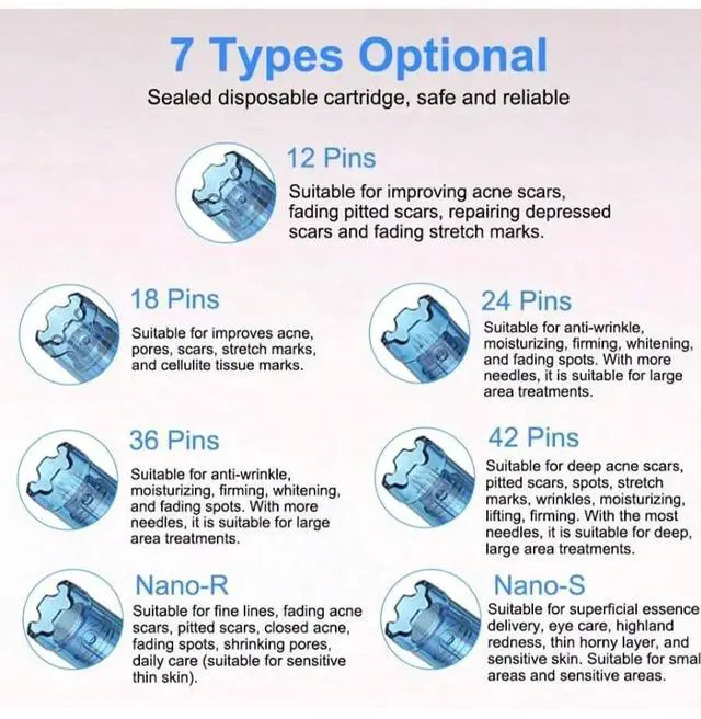 42 Pins: Needles made of 304 stainless steel, suitable for deep acne scars, pitted scars, spots, stretch marks, wrinkles, moisturizing, lifting, firming. With the most needles, it is suitable for deep, large area treatments.