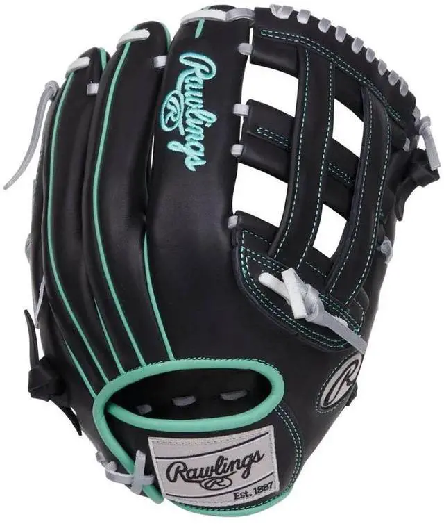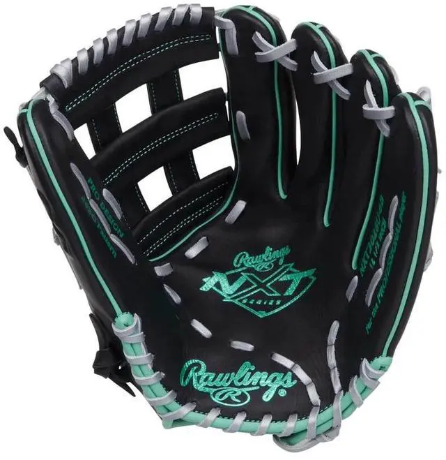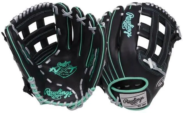 Prowl the outfield with the Rawlings NXT Series ContoUR 12.5-inch outfield glove. We designed and crafted this series for the typical travel ball player, as it features high-quality leather, making it easier to break in and shape the way you need it to! This 12.5-inch outfield glove sports a Pro-H web, allowing for quick transfers to throw out runners on the base paths. The 302U pattern provides fielders with a deep pocket and extension that is perfect for reeling in balls that may be out of reach. For added comfort of the glove, this entire collection reps the ContoUR fit, giving players with thinner hands a more secure fit. Additionally, there are padded thumb sleeves to help eliminate the sting of line drives hit your way. The colorway on this NXT infield glove sports a black shell with mint green stitching and piping. For added white accents, there is a white Rawlings patch and white laces. Bring some swagger into the outfield, thanks to the Rawlings NXT series offering pro-style patterns, pro-web designs, and new colorways! Grab your Rawlings NXT ContoUR 12.5-inch outfield glove today.