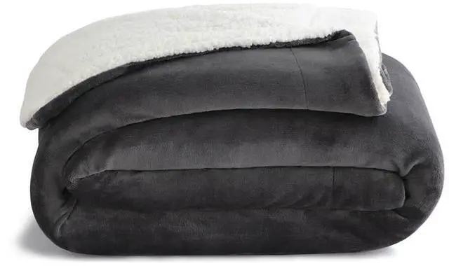Reversible blanket has a soft fleece side and cozy sherpa side