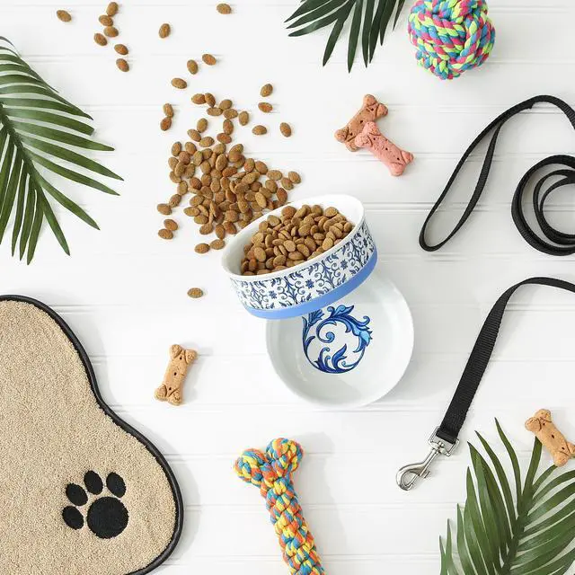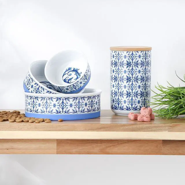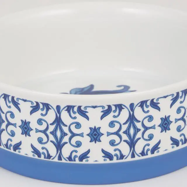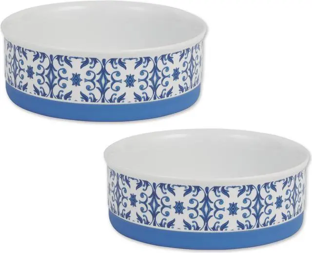 Set of 2 medium pet bowl measures 6 inches Dia x 2 H inches, suitable for both cats and dogs. California Prop 65 compliant and FDA food safe. Pet bowls are made of porcelain ceramic with a silicone ring to keep from sliding on the floor. Conveniently dishwasher safe so it can be easily cleaned. No Fuss. Silicone rim at the bottom will keep your pet's bowl from sliding around on the floor and help keep the bowl upright. No messy floors to clean. Delight your hungry pup or sassy cat with a fun printed food or water dish.