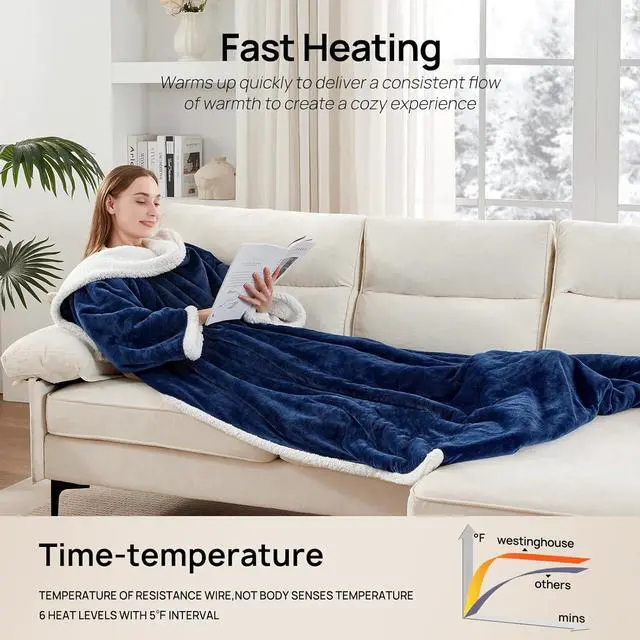 Westinghouse Electric Snuggle Throw Blankets with Foot Pocket, Wearable Heated Blanket with Sleeves, 6 Heating Levels & 2 to 10 Hours Heating Time Settings, 50 * 70"+18", Navy