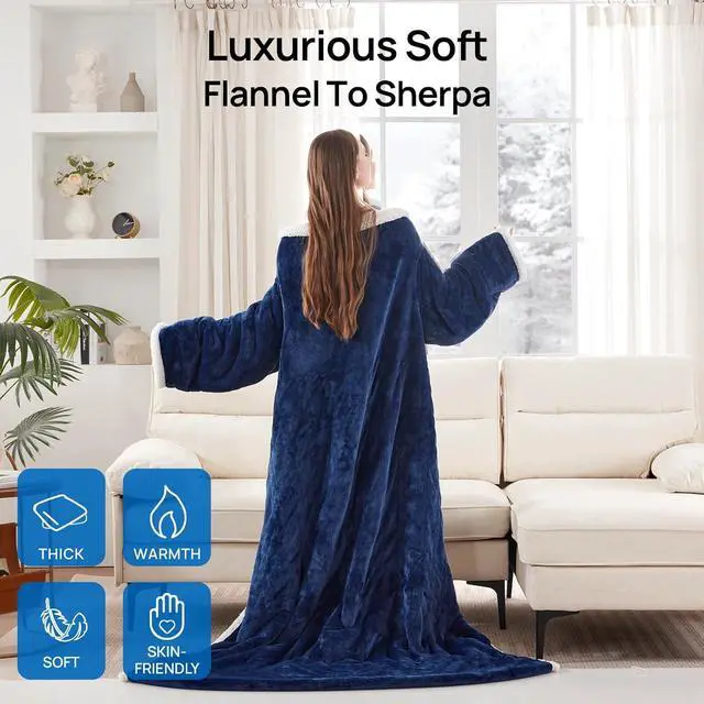 Warm & Comfy Designed - Made with 200 GSM of ultra-warm Sherpa inside and 200 GSM soft Flannel fleece face. Feet pocket Length: 18", Sleeve Length: 25.5", Sleeve Circumference: 18". Functional and practical, ideal for watching TV, lounging on the sofa/bed, gaming, reading a book, napping, or studying
