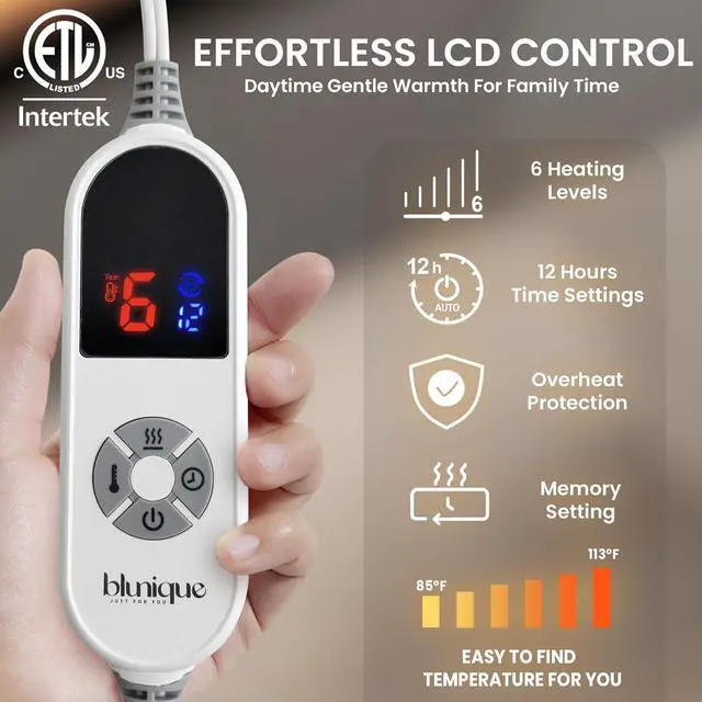 EASY LCD CONTROL Set Your Perfect Comfort Level:The upgraded LCD controller shows heat and timer settings at a glance. Choose from 6 heat levels and set the timer for up to 12 hoursso everyone in the family can find their perfect comfort zone, from gentle warmth for reading to higher heat for preheating a cold bed.