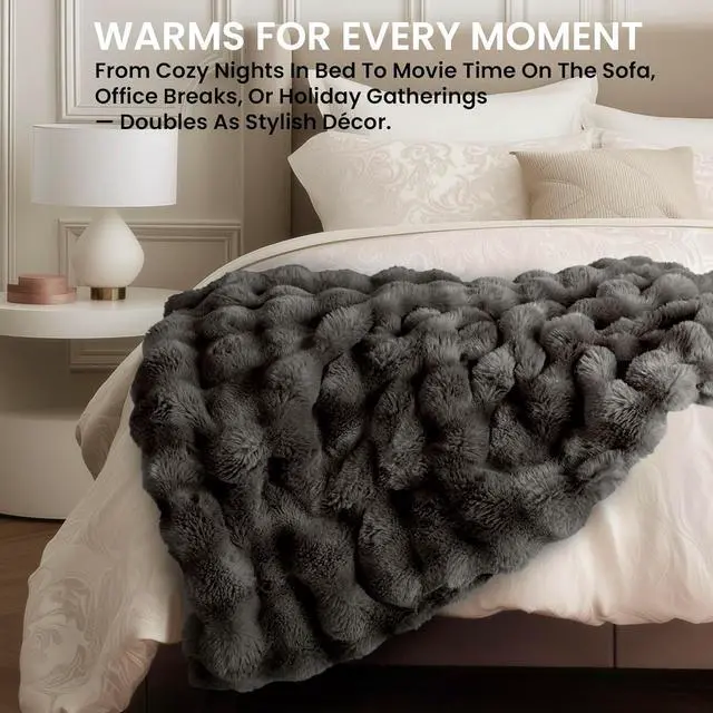 LUXURIOUSLY SOFT & FUNCTIONAL Plush Faux Rabbit Fur & Velvet: Crafted with 450gsm wave-textured faux rabbit fur, this blanket offers a luxurious, cloud-like appearance while creating fluffy air pockets that trap warmth and effectively prevent heat loss. On the reverse, 190gsm velvet provides a silky-smooth, skin-friendly touch, helping the blanket deliver comforting warmth to your body more quickly. The dual-fabric design blends elegant style with practical performance, making it both a chic décor accent and a reliable source of cozy comfort through every season.