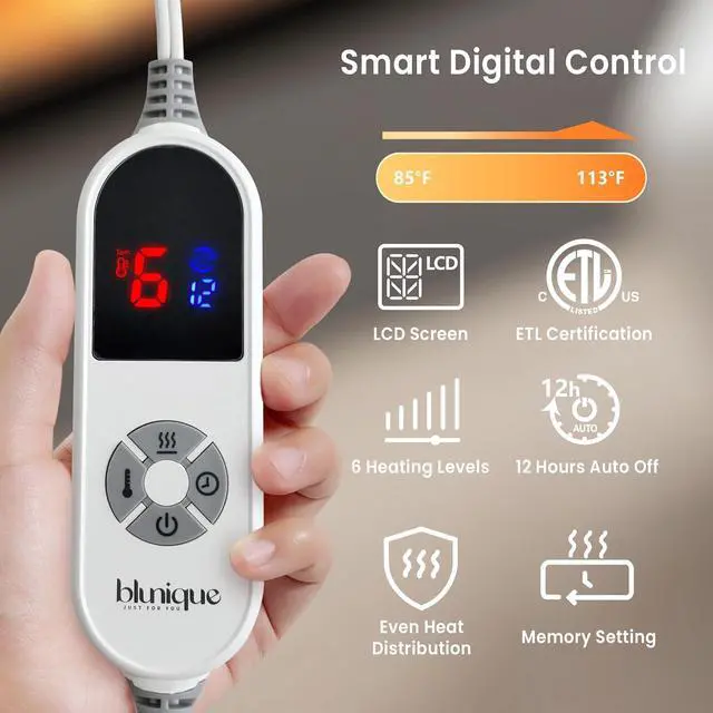 EASY LCD CONTROL Set Your Perfect Comfort Level:The upgraded LCD controller shows heat and timer settings at a glance. Choose from 6 heat levels and set the timer for up to 12 hoursso everyone in the family can find their perfect comfort zone, from gentle warmth for reading to higher heat for preheating a cold bed.