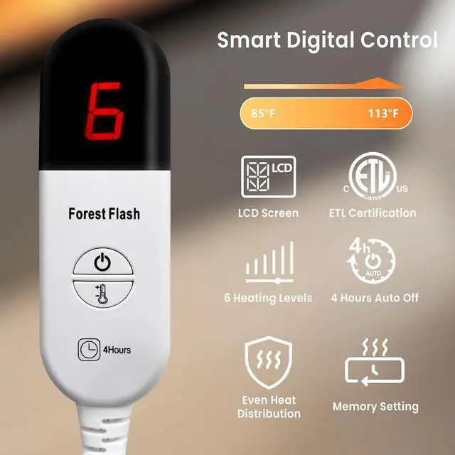 EASY LCD CONTROL Set Your Perfect Comfort Level:The upgraded LCD controller shows heat and timer settings at a glance. Choose from 6 heat levels and set the timer for up to 12 hoursso everyone in the family can find their perfect comfort zone, from gentle warmth for reading to higher heat for preheating a cold bed.