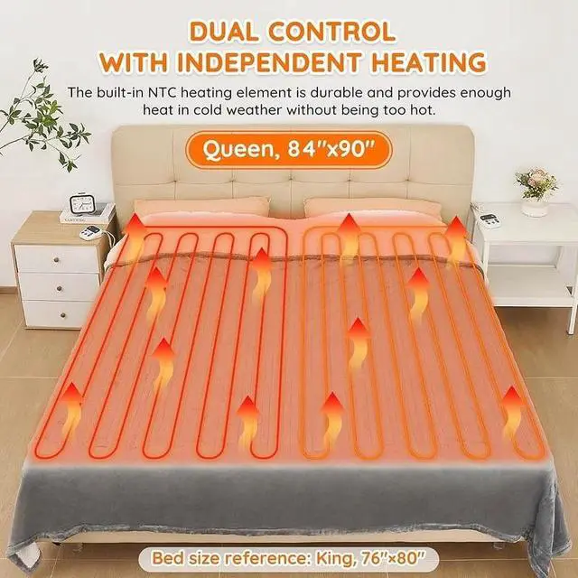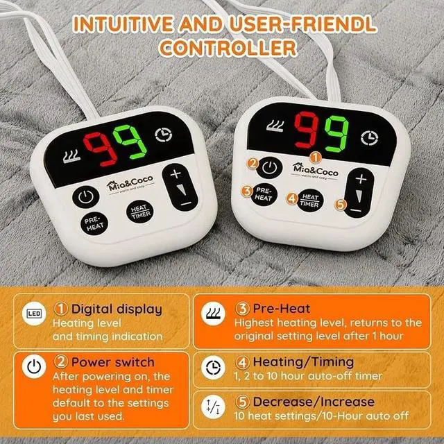 keycap_3:10 Adjustable Temperatures, 10-Hour Smart Auto-Off TimerThe heated blanket for women offers 10 temperature levels: 1, 2, 9, and H (77-127°F). A 10-hour programmable timer and a 3-hour default auto-off feature provide dual automatic protection. Once the set timer is reached, the electric blanket queen size automatically shuts off, ensuring safety and energy savings. By turning off your thermostat, using our heated blankets can help you save 68-90% on your heating bills annually.