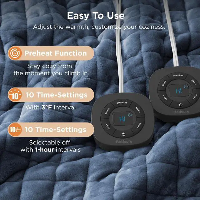 Safe & Easy Care:Tested with 74 safety checks in Bedsures Intertek-recognized lab and ETL/FCC certified, with PTC/NTC sensors and auto shutoff for worry-free warmth. When its time to clean, detach the controller and machine wash for lasting comfort