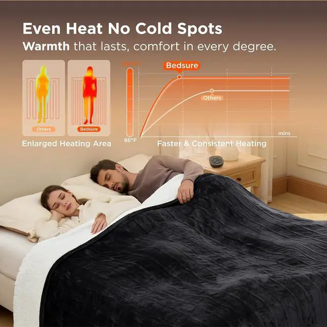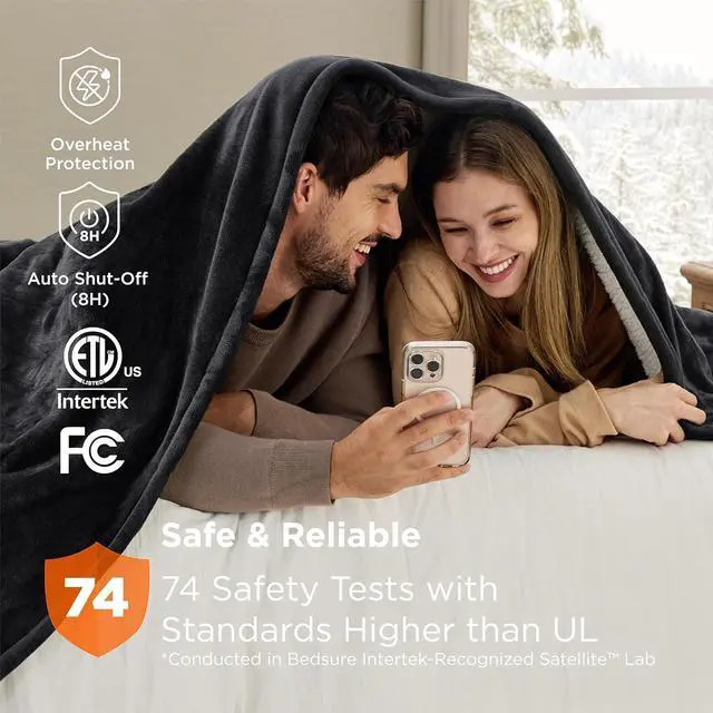 Safer & More Reliable: Conducted in Bedsure Intertek-Recognized Satellite Lab, 74 safety tests with standards surpassing UL ensure safer performance. This electric blanket queen is ETL and FCC certified, and its default 8-hour auto shut-off prevents it from overheating so that you can enjoy warmth with complete peace of mind