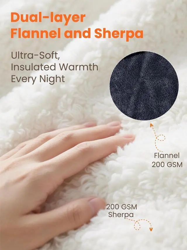 PREMIUM MATERIAL & EVEN HEAT DISTRIBUTION: Crafted from 200 GSM ultracozy flannel top and 200 GSM plush Sherpa backing, this electric heated blanket delivers uniform, edgetoedge warmth without cold spots. Reinforced stitching prevents shedding and enhances durability.