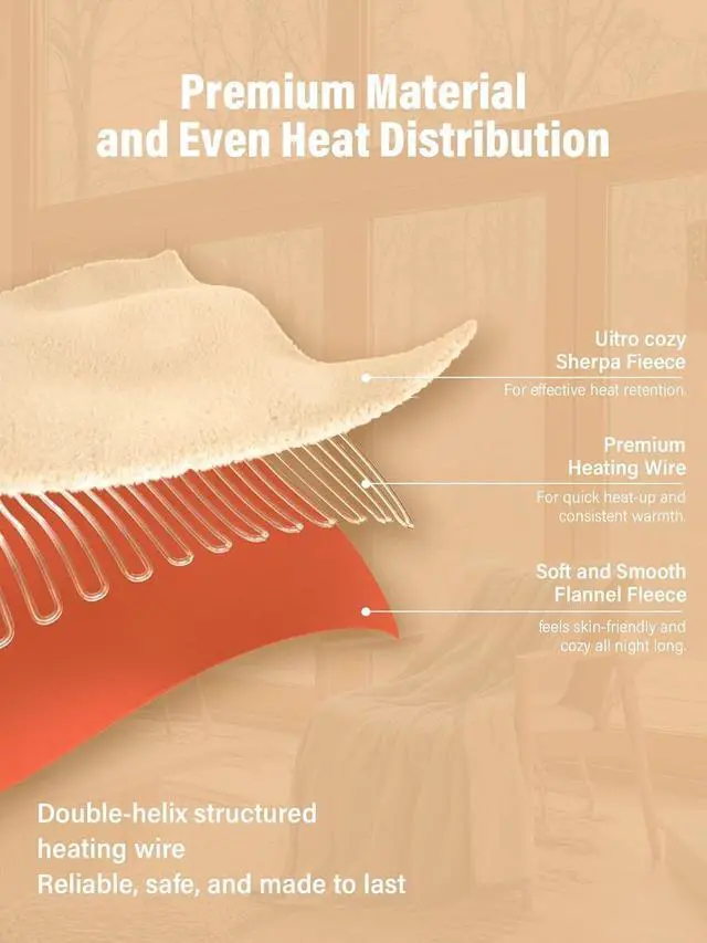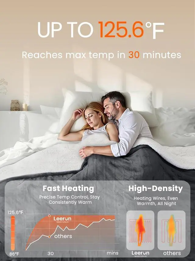 FAST HEATING & PRECISE TEMPERATURE CONTROL: Fulllength 2.2 mm PTC & NTC heating wire technology brings rapid warmup in minutes and maintains stable temperature across 8 heat levels (86125.6 °F). Important Safety Instructions: This heated blanket is intended for adult use only (18+). Do not fold, bunch, or crease the blanket while in use. Do not cover the heated blanket with other bedding, quilts, or fabrics during operation. Improper use may result in abnormal heat buildup.