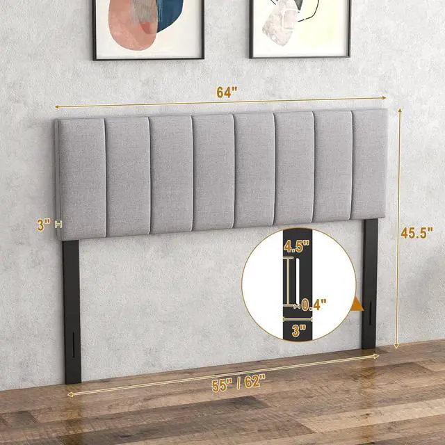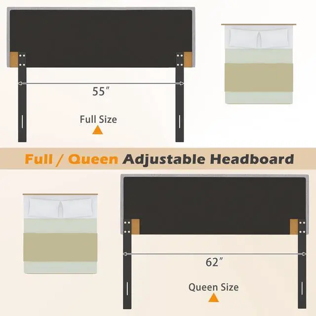 Full/Queen Size Bed: The headboard is available in 2 optional adjustable width to fit full or queen size bed frames. There are 2 sets of pre-drilled holes at the back, so you can expand the headboard from 55 to 62 to fit different bed frame easily.