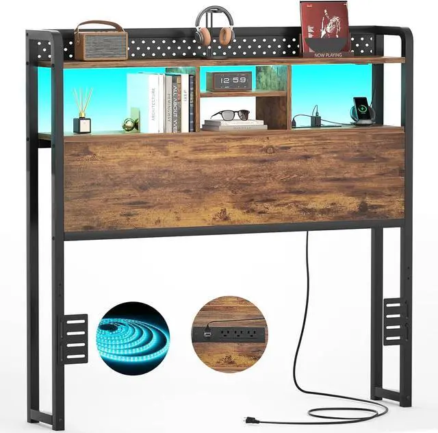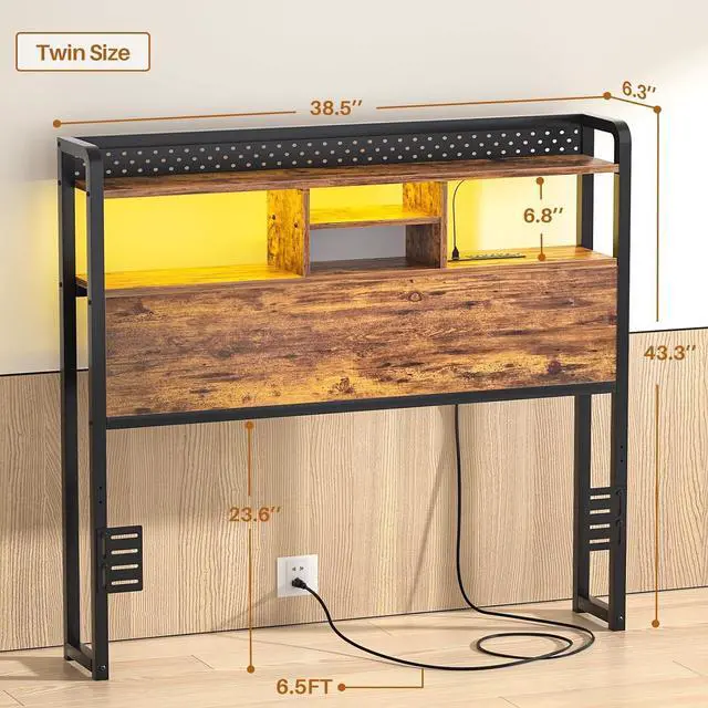 Large Storage Space & Classic DesignThe twin size headboard comes with 3-tier storage shelves which are designed for storing cell phones, alarm clocks, books, and some other personal belongings to keep your room looking organized, creating a clean and comfortable sleeping environment. The unique thoughtful guardrail, exquisite wood panel with black iron frame showcases a strong retro color.