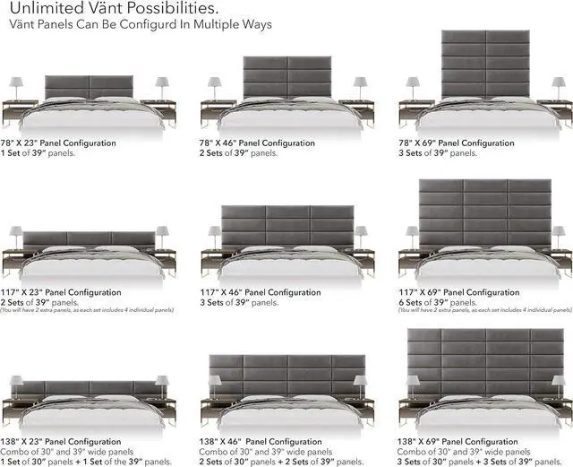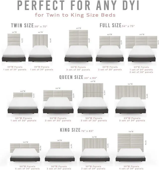 Convenient Package - Each box contains 4 wall panels in 11.5 " H by 30" W or 39" W that fits perfectly whether as upholstered headboard queen or wall mounted headboard king, or twin and full size. Mounting hardware is included in every package for your convenience.