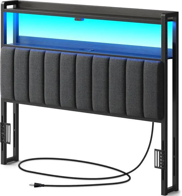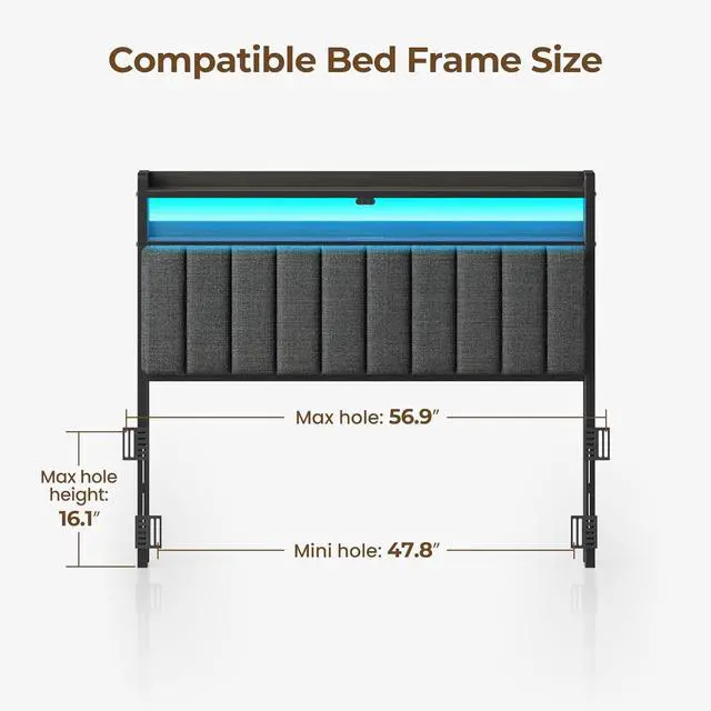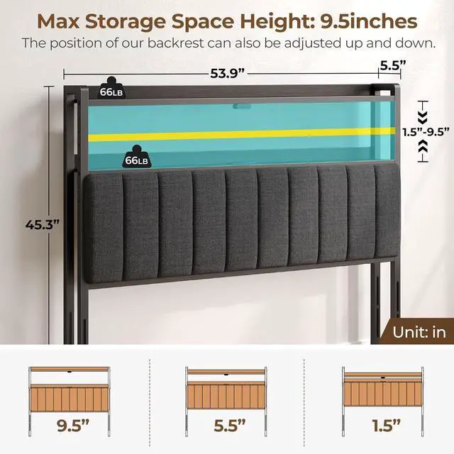Large Storage Space: Headboard with two levels of storage. The height of the first level storage space can be adjusted up to 9.5 inches, which can store almost all the items we use in bed every day, such