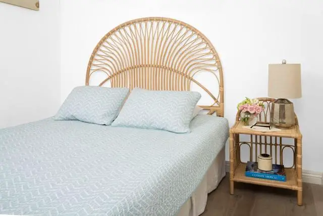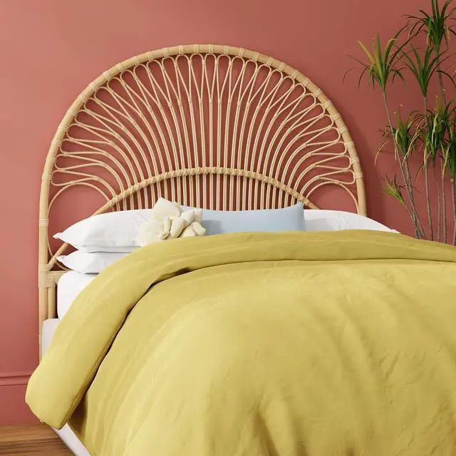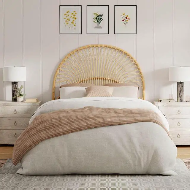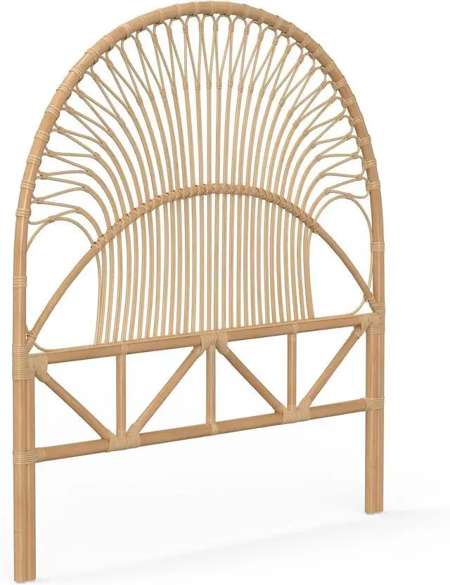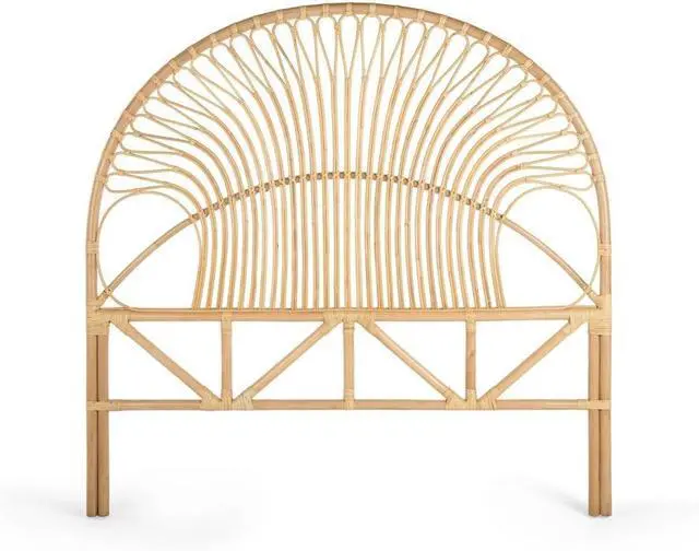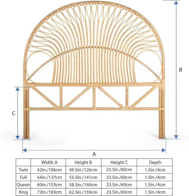 54 inches wide x 55.5 inches high x 1.25 inches deep Hand crafted from naturally grown rattan Sandwich headboard between Wall and bed frame. No connecting bracket supplied. Head Board is very light in weight Dust or clean with damp cloth