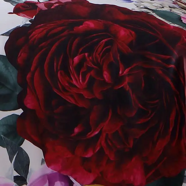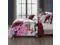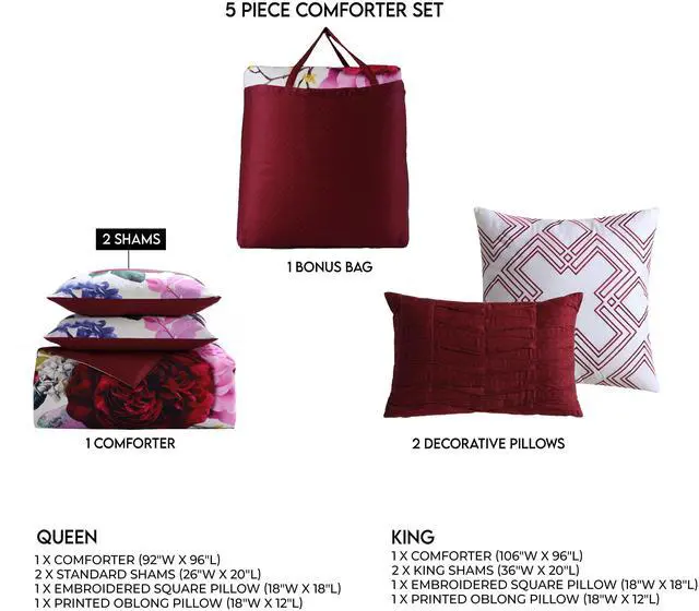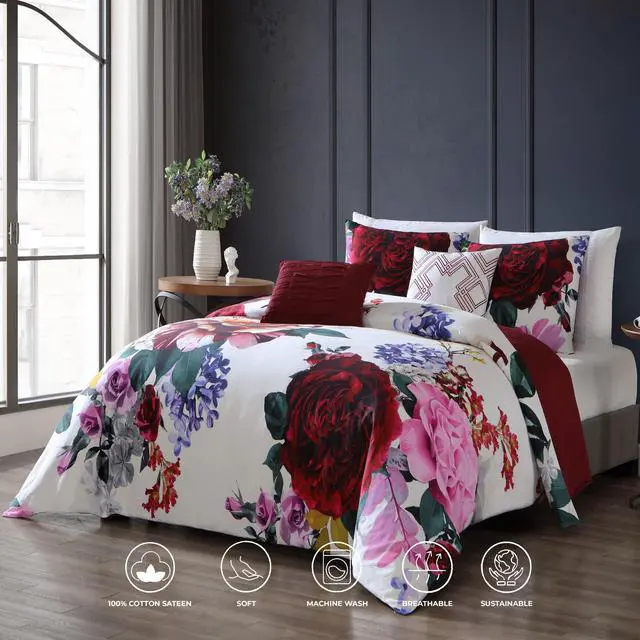 Shades of magenta, burgundy, pink and purple form bouquets on a cream background on the Bebejan Magenta Floral 5 Piece Reversible Comforter Set. The cheery colors will brighten any bedroom with dreams of flower gardens in full bloom. The reverse has a printed quilt texture in a rich burgundy color that coordinates with the floral front beautifully. The high quality 200 Thread Count 100% cotton sateen set includes 1 reversible comforter, 2 zipper shams and 2 decorative pillows. One pillow has a geometric embroidery pattern, while the other is a fabric pleated face bringing dimension to the set.