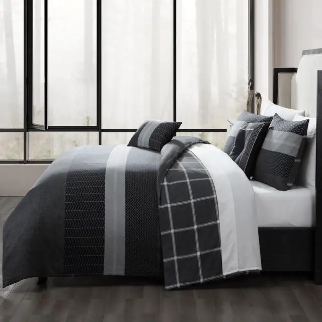 The herringbone and tweed patterns of the Bebejan Kyle 5 Piece Reversible Comforter Set are perfect for a more masculine look in your room. The striking stripes on a high quality 200 Thread Count 100% cotton sateen are in shades of black and grey for a contemporary or transitional feel. The back reverses to a windowpane plaid print for two versatile looks. The set includes 1 reversible comforter, 2 zipper shams and 2 decorative pillows. One pillow is embroidered with a tufted button, while the other is printed.
