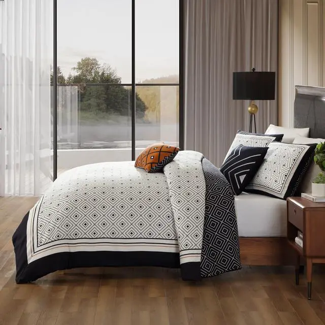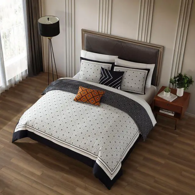 The Geometric Black and White 5 piece reversible comforter set has a modern diamond pattern with a classic framing at its edges. A pop of golden brown in the oblong printed pillow as well as a thin border on the comforter face adds interest. The reverse print is the direct opposite coloration of the front pattern with a black ground and white diamond pattern. This 200 Thread Count 100% cotton sateen 5 piece set also includes 2 shams, an 18x18 embroidered pillow, and a 18x12 printed pillow. As a bonus, the set is packaged in a reusable self-fabric tote.