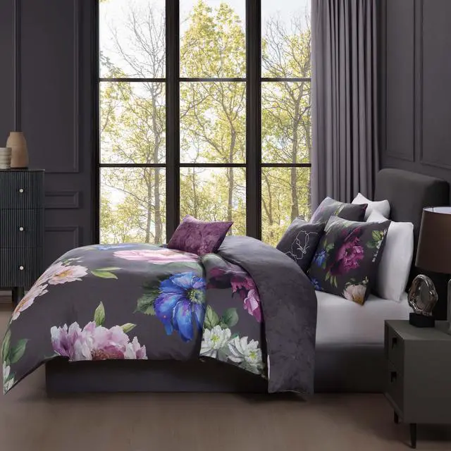 Adorn your bed with a sophisticated floral print in soft pinks, vibrant blues, and rich purples set against a dark grey background. The reverse side features a beautifully textured dark grey print to compliment the comforter face. To enhance the printed shams and comforter, there is a dreamy abstract printed pillow and an embroidered pillow with a floral linework design. The comfy 100% cotton sateen comforter set includes 2 shams, 1- 18" x 18" embroidered pillow and 1- 22" x 12" printed pillow. As a bonus, the set is packaged in a reusable self-fabric tote.