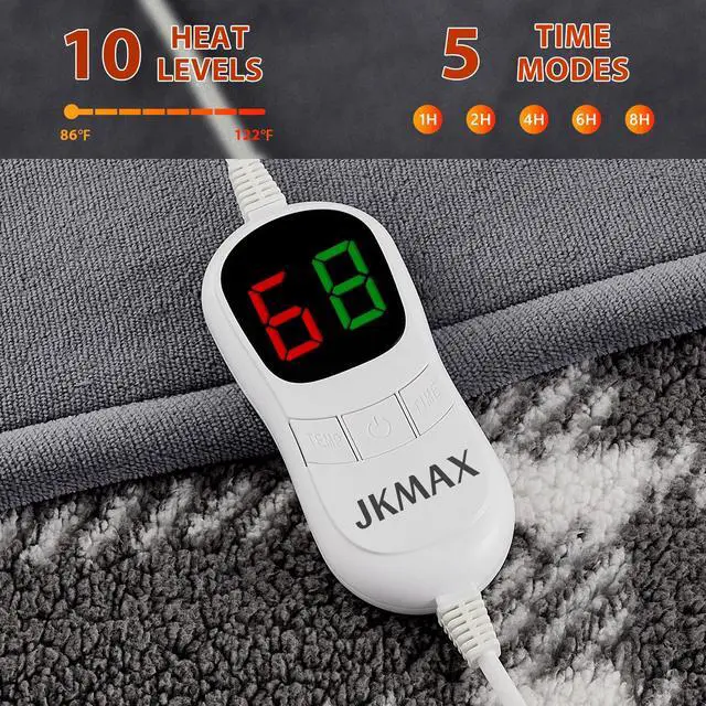 EXCELLENT DESIGN: JKMAX heating blanket has 10 heating levels and 5 time settings. The temperature range is 86-122 °F. You can choose your favorite temperature to set, and the controller only has three buttons, making the operation very simple