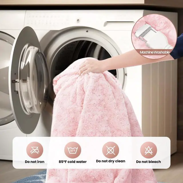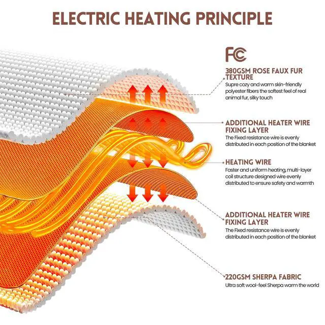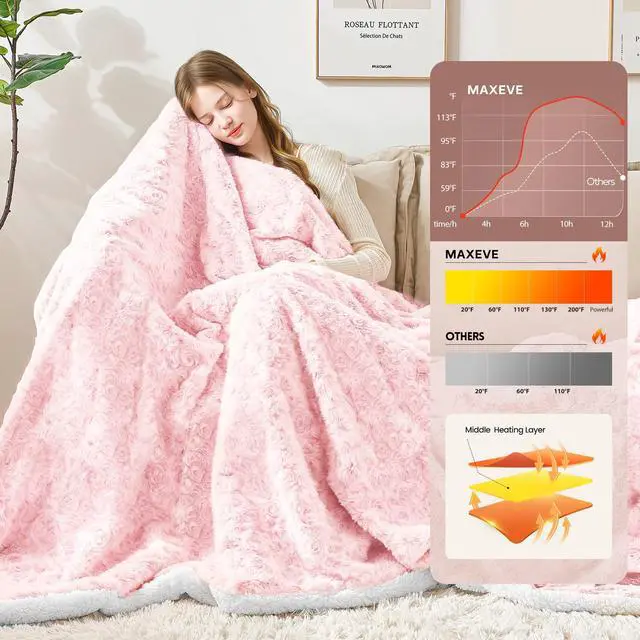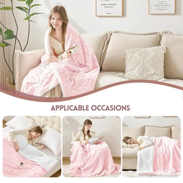 FASTER HEATING & MORE EVEN: Our electric blanket features long U-shaped heating wires that distribute heat more evenly across a wider area, allowing for faster and more efficient warming. Simply set it to the highest temperature for rapid heating and feel cozy in no time. The blanket heats up quickly, becoming warm to the touch in around a minute. It provides consistent heat across the entire surface. SAFE TO USE: Certified by ETL and FCC, the blanket includes an overheat protection system. If the controller exceeds 158 or the heating wire reaches 248, it will automatically shut off to ensure your safety. Designed to operate at 120V, it is also energy-efficient and cost-saving. This heated blanket will keep you warm while lounging on the couch and that you can keep wrapped around your body as you waddle over to your kitchen to make your favorite cold weather drink. EASY CARE & MACHINE WASHABLE: For easy care, the blanket is fully detachable. After disconnecting the controller, it can be machine washed or hand washed in water up to 85. Please note: Do not dry clean, bleach, or iron. Do not plug in or operate the blanket while it is damp. Ensure it is completely dry before use. The fabric came out of the dryer thicker and fluffier, not to mention in just as good of shape as when it went in, proving its durability. WARM HEATED BLANKET: Crafted with ultra-soft 380 GSM faux rabbit fur and 200 GSM sherpa fleece, this electric blanket offers exceptional comfort and warmth. This heated blanket is so soft and plush that it will keep you cozy and warm even if you dont turn on the heating elements. With 6 adjustable heat settings (95 to 122) and 12 auto-off timer options (from 1 to 12 hours), you can customize your experience for precise temperature control during cold winter nights. GOOD GIFT TO HER: This elegant heated blanket, adorned with luxurious rose patterns, make a thoughtful gift for your wife, daughter, or grandmother on birthdays, Christmas, or any special occasion. Its the perfect way to show your love and keep your loved ones warm and cozy on cold winter evening. This electric blanket is suitable for various places, such as when watching TV, relaxing on the sofa at home, or working in the office. It can provide you with a warm and comfortable experience.