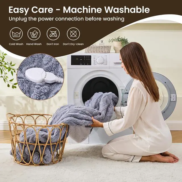 - Machine Washable: The electric blanket can be machine washed in cold water, tumble dry at low heat. Please take off the controller cord before washing. After cleaning, use the product only when it is completely dry. When use the Electric Blanket, first connect the controller section with blanket ,and then the before plugging it in. Do not connect the power cord socket before connecting the blanket plug